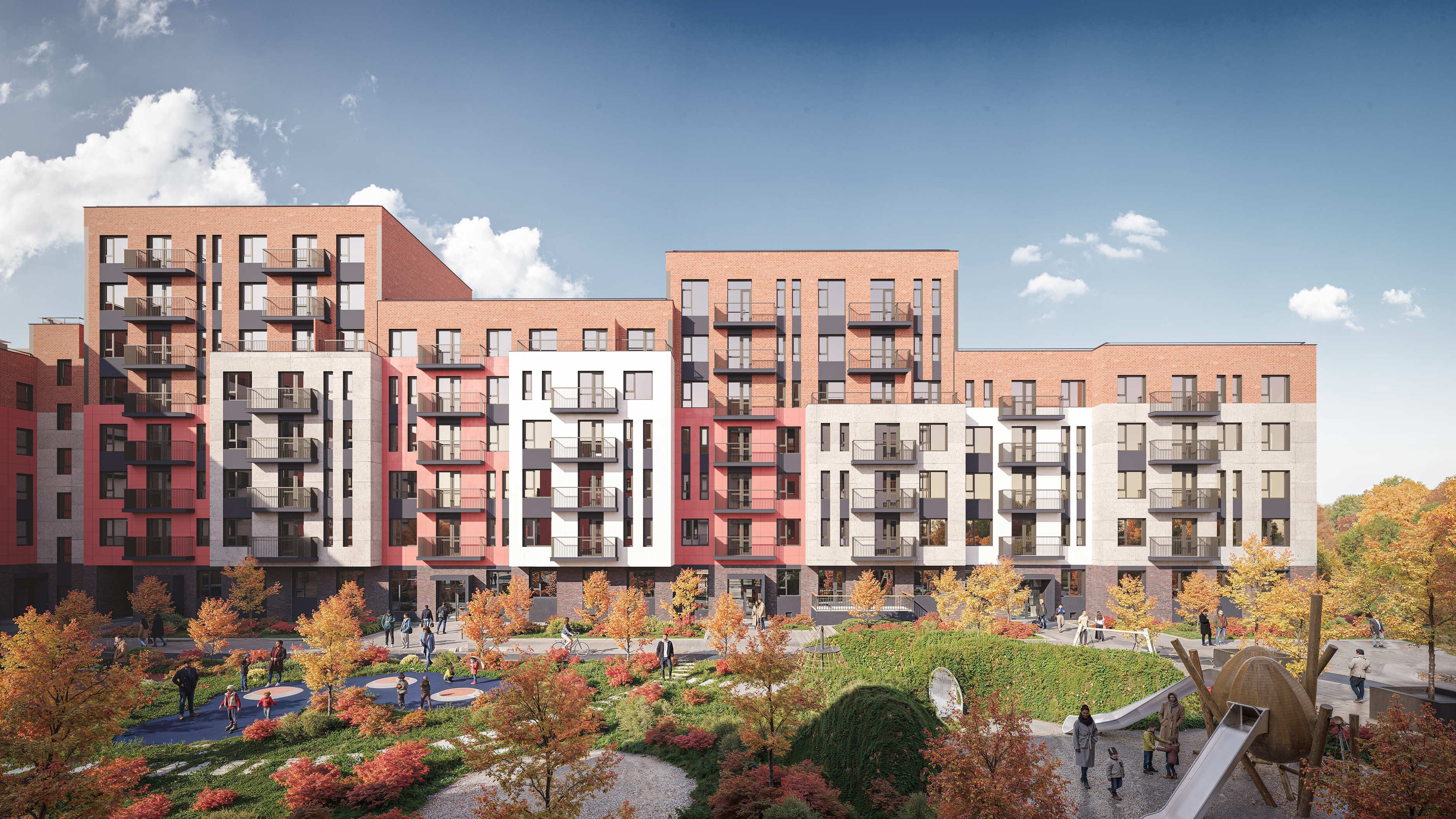 Дворы без машин, зоны отдыха для всех возрастов и открытый паркинг формируют безопасную и уютную среду. Набережная вдоль ручья с амфитеатром станет местом прогулок и встреч, а минимаркет «Пятёрочка» и коммерческие помещения на первых этажах обеспечат удобство каждый день.